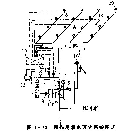 1-總控制閥;2-預作用閥;3-檢修閘閥;4-壓力表;5-過濾器;6-截止閥;7-手動開啟截止閘;8-電磁閥;9-壓力開關;10-水力警鈴;11-壓力天關(啟閉空壓機)12-低氣壓報警壓力開關;13-止回閥;14-壓力表;15-空壓機;16-火災報警控制箱;17-水流指示器;18-火災探測器;19-閉式噴頭預作用噴水滅火系統(tǒng)工作原理:發(fā)生火災時,火災探測器報警后,自動控制系統(tǒng)控制閘門排氣、充水,由干式變?yōu)闈袷较到y(tǒng)。只有當著火點溫度達到開啟閉式噴頭時,才開始噴水滅火。