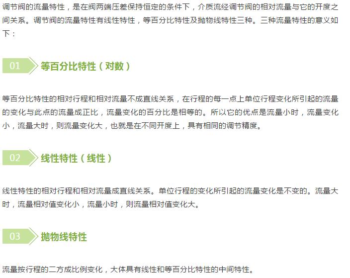 固有流量特性:假定閥門前后壓差為定值,得出的介質(zhì)流過閥門的相對流量與相對行程之間定關(guān)系。我們調(diào)節(jié)閥招標(biāo)書上的流量特性的快開、直線、等百分比和拋物線均指的是固有流量特性。