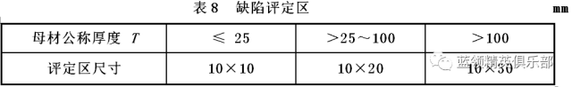 “5.1.5.1  圓形缺陷用圓形缺陷評定區(qū)進行質(zhì)量分級評定,圓形缺陷評定區(qū)為一個與焊縫平行的矩形,其尺寸見表8。圓形缺陷評定區(qū)應選在缺陷最嚴重的區(qū)域。
