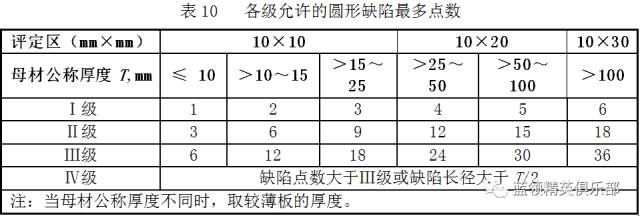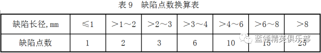 5.1.5.2  在圓形缺陷評定區(qū)內(nèi)或與圓形缺陷評定區(qū)邊界線相割的缺陷均應劃入評定區(qū)內(nèi)。將評定區(qū)內(nèi)的缺陷按表9的規(guī)定換算為點數(shù),按表10的規(guī)定評判焊接接頭的質(zhì)量級別!