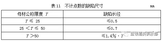 4、如下表中所示,母材厚度在規(guī)定范圍內(nèi)不計點數(shù)的缺陷尺寸。若母材公稱厚度為23mm,當缺陷長徑小于0.5mm,則該缺陷不計入點數(shù)換算。